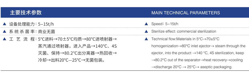 概述:產(chǎn)品先經(jīng)預(yù)熱后,蒸汽直接噴入產(chǎn)品,使產(chǎn)品在瞬時(shí)被加熱到設(shè)定溫度,經(jīng)過一定時(shí)間的保溫后,通過真空分離器把產(chǎn)品瞬間降溫,并等量蒸發(fā)掉因蒸汽噴入增加的水分,最后產(chǎn)品在無菌條件下冷卻、灌裝。